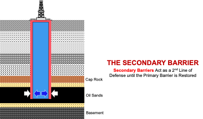 Figure 3: When the primary barrier fails – The overbalance is lost and hydrocarbons have entered the wellbore, a 2nd line of defense is required that prevents the hydrocarbons from being released into a weaker zone or into the environment. The secondary well barriers (Casings, Cement, Wellhead Seals, BOPE, etc) act as the 2nd line of defense and maintain control of the well until the primary barrier is re-established. Drilling resumes only after the primary well barrier is re-established.